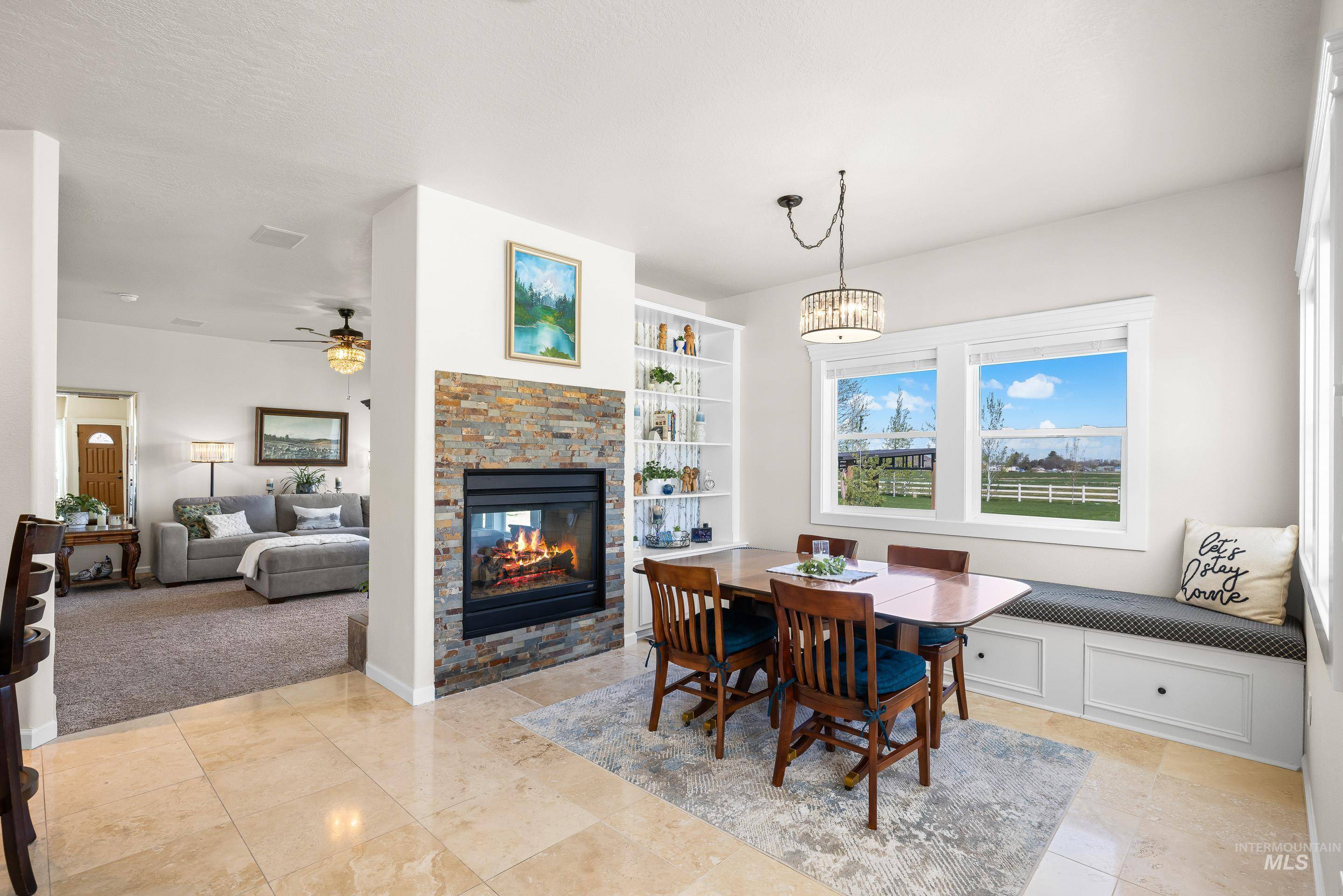 Stunning, must-see estate home on a 1-acre lot in Ada County with fabulous views of the foothills and no backyard neighbors. Main level primary suite features a fireplace, sitting area and private access to backyard patio. Primary bath features walk-in shower, soaker tub and quartzite counter tops. Kitchen features travertine tile floors, granite countertops, stainless appliances and granite island with seating option. Living room features a two-sided fireplace with dining area. Bonus room on second floor with bar/kitchen area and stunning views. Bedrooms two & three feature walk-in closets and a Jack-and-Jill bathroom. Fourth bedroom features an ensuite with shower and large walk-in closet. 34x34 detached insulated shop with unfinished bonus space above. Set in a community with 27 homes and 25 acres of common area including 1.4 miles of private walking paths.